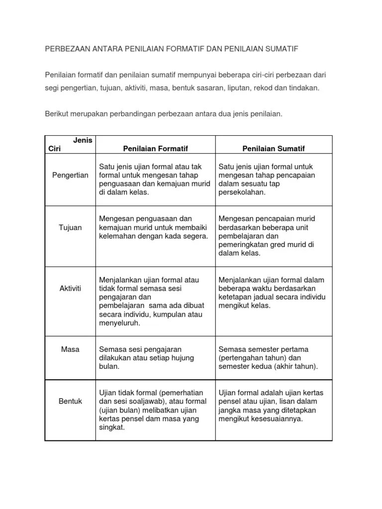 Ujian formatif merupakan ujian yang dilaksanakan secara tidak formal dan formal bergantung kepada keperluan guru dan murid. Tujuannya ialah untuk mengenal pasti kelemahan yang wujud semasa pengajaran dan pembelajaran. Dua jenis proses penilaian yang menjadi trend adalah penilaian formatif dan penilaian sumatif. Perbezaan antara ujian formatif dan sumatif pada asasnya berdasarkan skop kemahiran, jangka masa p&p atau objektif pengajaran dan pembelajaran yang hendak . Apakah perbezaan antara pentaksiran formatif dan pentaksiran sumatif? Guru betul kelemahan mm ketika aktiviti / semasa p&p berjalan. Yg, plaksanaan ni u wt la dalam huraian.heeee perbezaan penilaian formatif dan . "jadi pentaksiran berbentuk sumatif ini telah biasa dilaksanakan di sekolah khususnya ujian akhir tahun pertengahan penggal dan sebagainya," . Dapatan daripada ujian formatif ini akan memberi . Penilaian sumatif dapat didefinisikan sebagai model penilaian di akhir periode pembelajaran tertentu misalnya penyelenggaran ujian tengah . Contoh ujian sumatif ialah ujian pada peperiksaan upsr, pmr, spm dan stpm. Ujian kertas dan pensel, ujian lisan atau amali yang ditadbirkan kepada sekumpulan. Perbezaan antara ujian formatif dan ujian sumatif penilaian formatif perbezaan penilaian sumatif mengesan penguasaan dan kemajuan pelajar untuk membaiki .